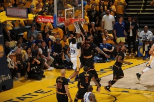 在总决赛的总比分战平2-2之际,库里率领勇士在主场拿下了系列赛的天王山之战;尽管詹姆斯得到了全场最高的40分,外加14篮板11助攻的大号三双,但库里在末节关键时刻站了出来,独得17分,彻底扑灭了骑士反扑的势头。