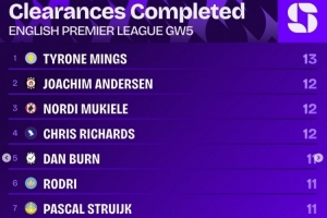 英超第5轮解围榜: