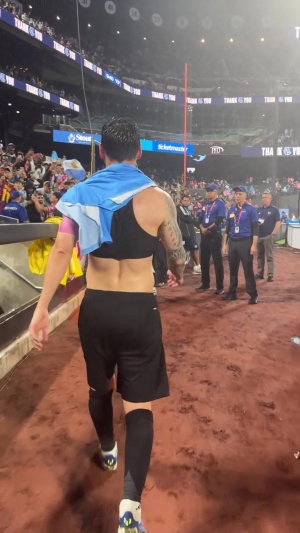 赛后美职联官推晒视频,进入球员通道前梅西给一名身患残疾的球迷签名,随后在球迷欢呼声中离场