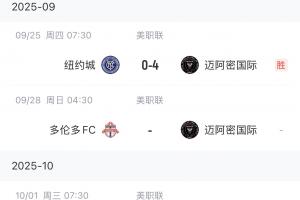 下场迈阿密国际比赛将是客场对阵多伦多FC,北京时间9月28日凌晨4点半开球。