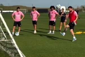 体育资讯9月27日讯 迈阿密国际社媒晒出队内训练视频,梅西和德保罗进行另类射门PK。