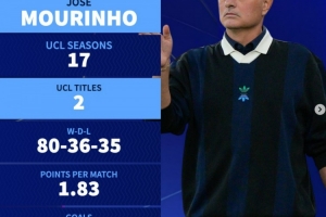 穆里尼奥共计带队17次征战欧冠,分别在2004年率领波尔图以及2010年率领国米夺得冠军,总战绩为80胜36平35负,场均积分1.83分,执教的球队共打进261球,丢139球。