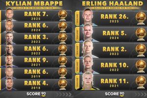 体育资讯10月03日讯 外媒Score90制作了一组对比图,罗列了姆巴佩和哈兰德的历年金球奖排名。