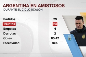 据ESPN统计,斯卡洛尼执教阿根廷以来带队参加29场友谊赛,战绩23胜4平2负,打进80球丢12球。
