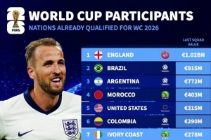 体育资讯10月15日讯 德国转会市场列出了锁定明年世界杯资格球队的身价排名,英格兰10.2亿欧居首,巴西、阿根廷二三位。