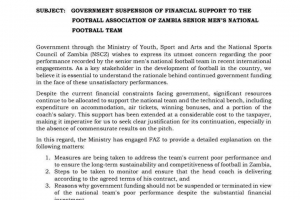 鉴于国家当前面临的财政困难,当局表示必须对继续资助球队的理由作出合理解释。该部门已要求赞比亚足协提交详细报告,说明为提升球队战绩所采取的措施、确保问责与透明度的具体办法,以及公共资源使用情况的清晰评估。