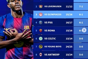 体育资讯10月22日讯 在本轮欧冠,巴萨6-1大胜奥林匹亚科斯。德转也盘点了巴萨队史在欧冠最大比分获胜纪录榜,具体如下: