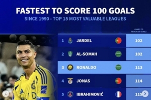近35年为单支球队最快打进百球榜:C罗113场第三,伊布、莱万在列