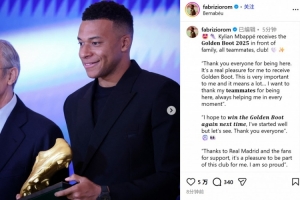 体育资讯10月31日讯 姆巴佩在今日领取了代表上赛季欧洲最佳射手的欧洲金靴奖,皇马全队现场见证。
